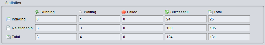 ステータス | タスクのステータスは以下の通りです。 Running—インデックス作成または検出タスクは実行中です。 Finished—インデックス作成または検出タスクは終了しました。 Fail_Waiting—1つ以上のタスクの子タスクが失敗しましたが、他の子タスクはまだ実行中です。 Failed—インデックス作成またはDiscoveryタスクは失敗しました。 Cancel_Waiting—キャンセルされた1つ以上のタスクがまだ実行中です。 Cancelled—インデックス作成または検出プロセスがユーザーによってキャンセルされました。 |