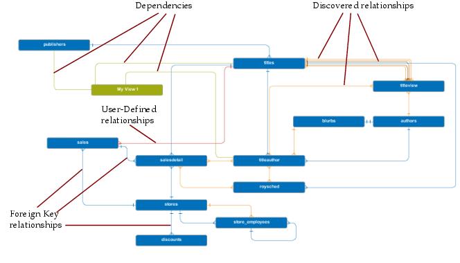 A model shows tables connected with lines that indicate relationships between the tables. If the data source has been indexed and discovered, all discovered relationships that have three or more matches and an RPS greater than 75 are displayed by default. See
