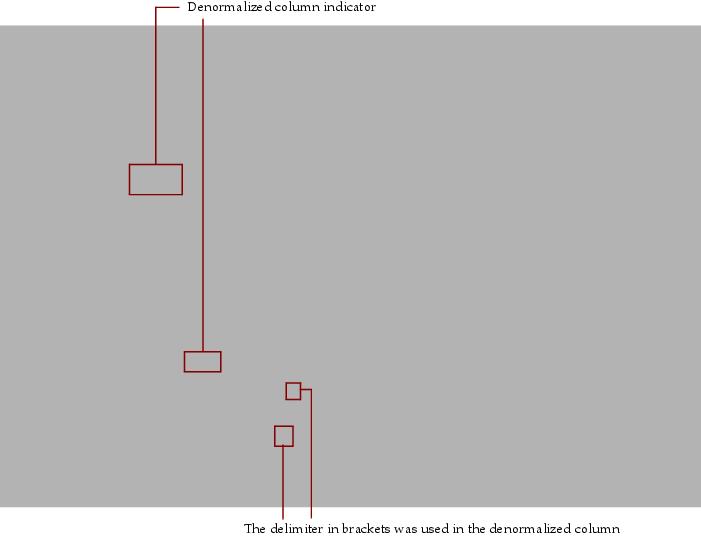 The denormalized indicator is displayed both on the Relationships tab and on the Relationship Column Details tab. On the Relationship Column Details tab, the delimiter used in the denormalized column is listed in the Relationship column. The tab and space characters (delimiters that are not visible) are indicated as \t and \s, respectively.