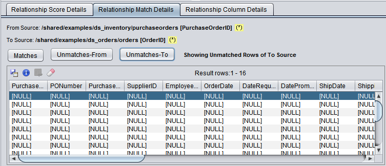 The Relationship Match Details tab displays the actual data in the tables in the relationship. You can view items that match, items in the from-table that do not match, and items in the to-table that do not match.