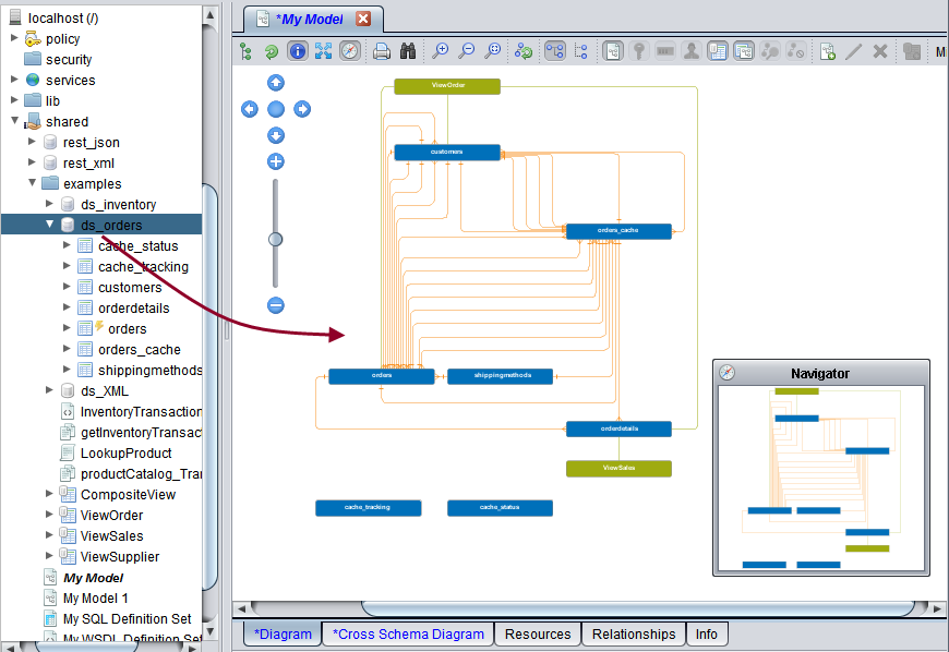— Tables in the selected resource (in blue). If you have indexed and discovered the resource, the model shows the table relationships.