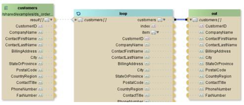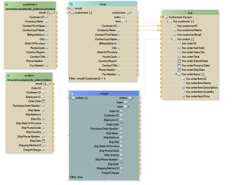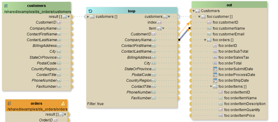 16. From loop, click in the operation handle next to customers and drag the line to foo:customer.