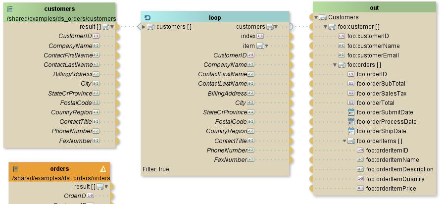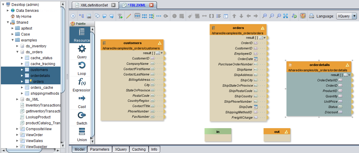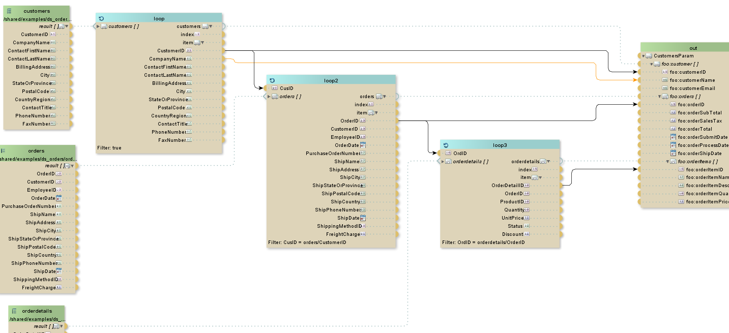 This tutorial uses three of the tables shipped with TDV from the Examples project (customers, orders, and orderdetails) to produce an XML document result.