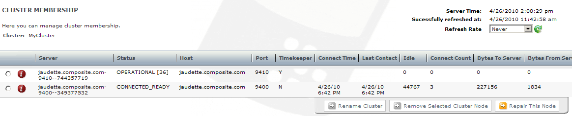 Connect Time | The duration, in minutes, of the connection established between the local TDV server node and the cluster node displayed in that row. This value is updated each time the server connects to a cluster node and becomes an active member of the cluster. This value defaults to GMT (Greenwich Mean Time), but you can change the time zone using the Web Services Interface configuration parameters. |