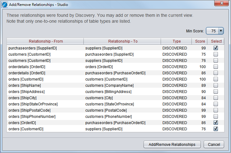 Studio displays a list of one-to-one relationships that have been discovered between the tables in this view.