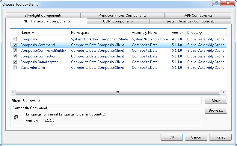 3. Check the check boxes next to the items you want to add as shown above. Visual Studio displays the toolbox items added.