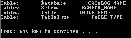 After you run the program, the following results appear. It shows that the metadata TABLES have four restrictions: catalog_name, schema_name, table_name, and table_type.