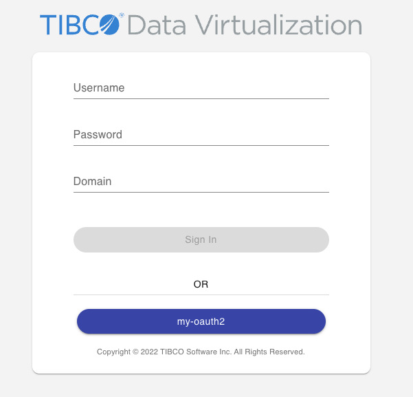 If an OAuth 2.0 domain has been set up and access tools privileges given to the user, then you can login to TDV Web UI by giving the OAuth 2.0 domain name (that has been setup in Web Manager) in the Domain field. Click on the domain name button that is displayed in the login screen. You will not need to provide username and password while using the OAuth 2.0 domain. The option to login to the OAuth2 domain will be available only if the domain is defined in the Web Manager.