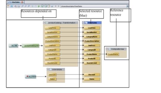 Studio displays the lineage for the selected resource including all resource dependencies and all reference resources. This example shows the data lineage for the ViewSales example view: