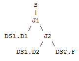 Here the ON clauses of the joins are such that both D1 and D2 are connected to F, and both joins are inner joins. In this case two semijoins are possible—one from D1 to F and the other from D2 to F—because they both target the same data source.