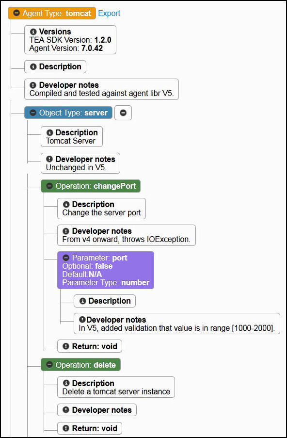 Developer mode lets GUI developers see a structural overview of an agent's managed object model. The overview includes agent type, object types, operations, parameters, return types, and developer notes. You can collapse and expand the branches of the overview diagram.