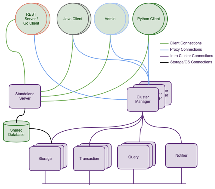 The diagram depicts a variety of components and other processes that communicate within a Graph Database ecosystem. (To simplify the diagram, the diagram omits redundant connections to duplicate processes).