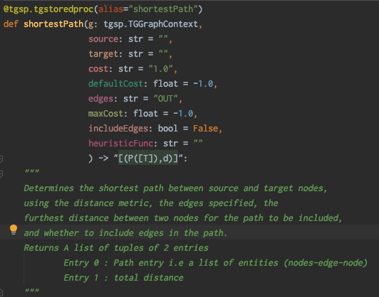 The Python function with a function decorator and a signature whose first parameter is a GraphContext ‘g’ serves as a contract between the Server and invoked python function. TGDB provides an API model to enable you to write efficient and optimized code.