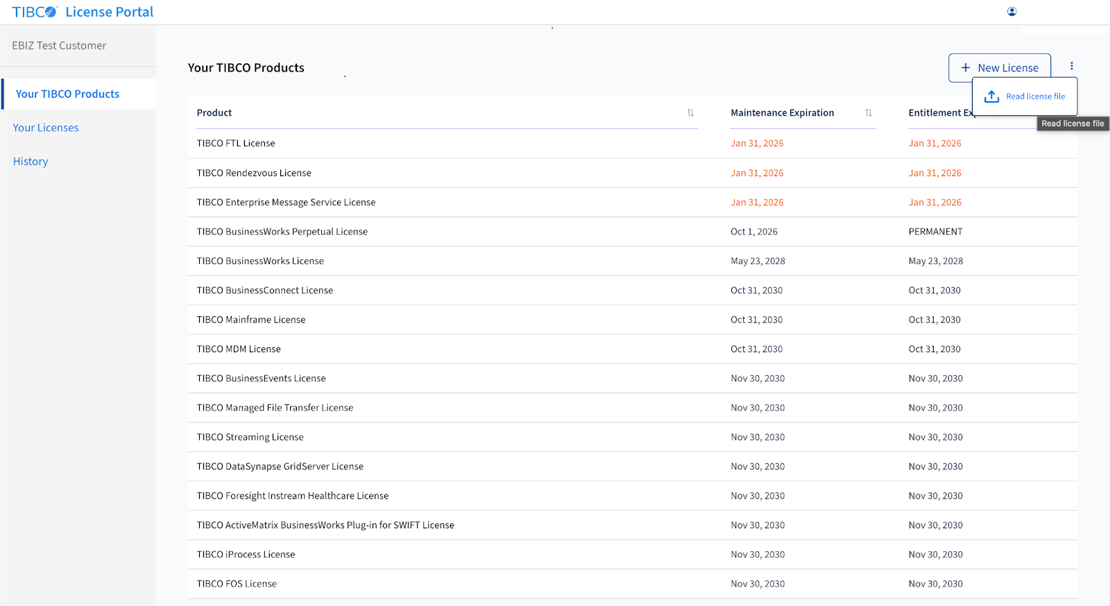 - Click the Kebab Menu beside New License on the Your TIBCO Products page to find the Read license file Option.