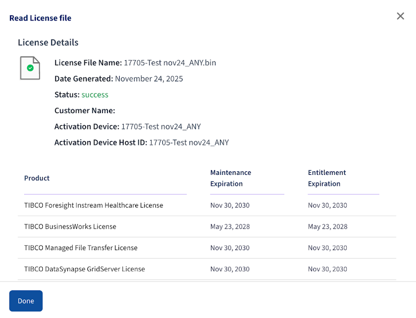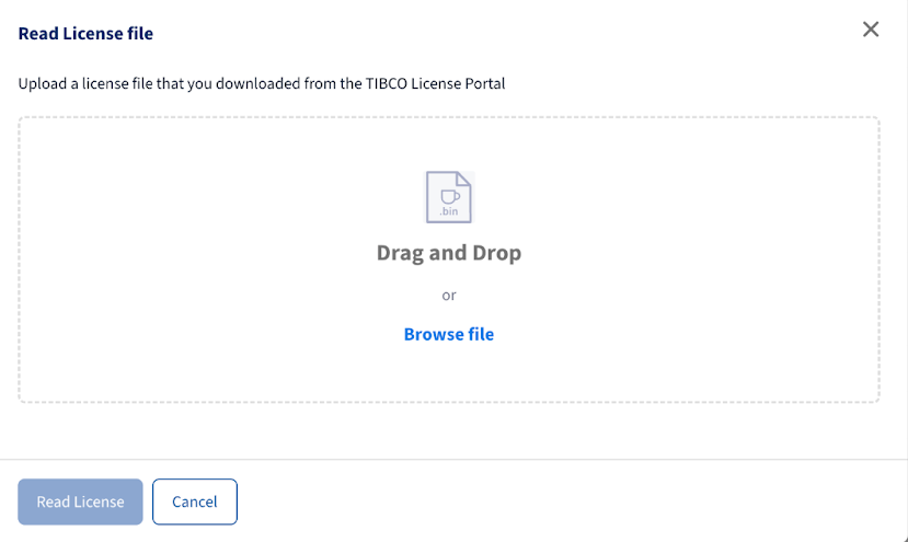 Note: - Click the Kebab Menu beside New License on the Your TIBCO Products page to find the Read license file Option.