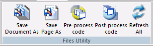 ページのインポートとエクスポート、ページの保存、ドキュメントへの実行前プロシジャまたは実行後プロシジャの追加を行えます。下図は、[ファイルユーティリティ] グループを示しています。