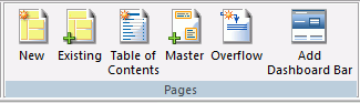 ドキュメントまたは Active Dashboard Analytic Document ダッシュボードに新しいページ、既存のページ、目次、ページマスター、オーバーフローページ、ダッシュボードバーを追加することができます。下図は、[ページ] グループを示しています。