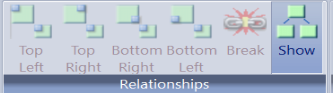 [関係] グループには、[左下合わせ]、[関係の解除]、[関係の表示] コマンドがあります。HTML ページおよびガイド付きレポートページには [左上合わせ]、[右上合わせ]、[右下合わせ] コマンドも表示されます。下図は、[関係] グループを示しています。
