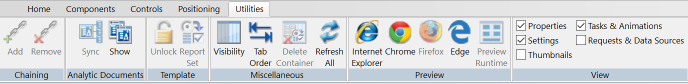 ドキュメントまたは Active ReportAnalytic Document での連鎖の追加または削除、ドキュメントまたは Active Dashboard Analytic Document ダッシュボードへの実行前プロシジャまたは実行後プロシジャの追加、ドキュメントまたは Active Dashboard Analytic Document ダッシュボードに関連するパネルの表示と非表示の切り替えを行えます。