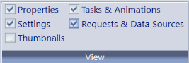 [表示] グループでは、ドキュメントまたは Active Dashboard Analytic Document ダッシュボードに関連するパネルの表示と非表示を切り替えることができます。下図は、[表示] グループを示しています。