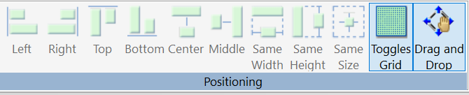 下図のように、[配置] グループには、[左揃え]、[右揃え]、[上揃え]、[下揃え]、[左右中央揃え]、[上下中央揃え]、[均等幅]、[均等な高さ]、[均等なサイズ]、[グリッドの切り替え] コマンドがあります。