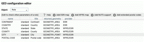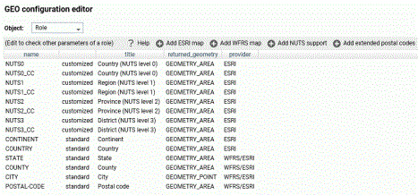 地理的役割を構成に追加するには、新しい ESRI マップまたはサーバでホスティングされるシェープファイルを追加して、新しいマップに地理的役割を関連付けることができます。NUTS 地理的役割サポートを実装することもできます。