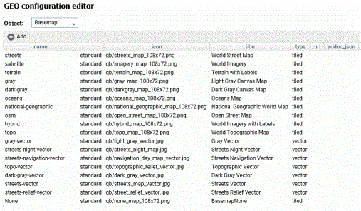 下図は、地理情報構成エディタを示しています。ここでは、[Basemap] オブジェクトが選択され、標準ベースマップのリストが表示されています。