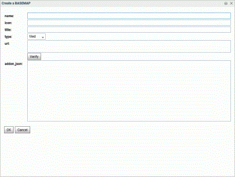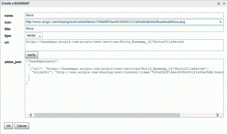 ベースマップの名前、サムネールの URL、表示するタイトル、およびベースマップを提供するマップサービスの URL を入力し、[確認] をクリックします。