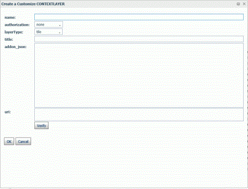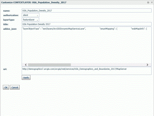 コンテキストレイヤの名前、認可タイプ、レイヤタイプ、表示するタイトル、コンテキストレイヤの描画に必要なアドオン JSON、およびコンテキストレイヤを提供するマップサービスの URI を入力し、[確認] をクリックします。