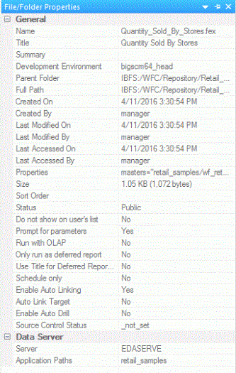 [ファイル/フォルダのプロパティ] パネルには、[環境ツリー] パネルで選択したフォルダまたはファイルのプロパティが表示されます。たとえば、[環境ツリー] パネルでフォルダを選択すると、[ファイル/フォルダのプロパティ] パネルには、そのフォルダの名前、タイトル、最終更新日などの情報が表示されます。[環境ツリー] パネルでレポートファイルを選択すると、[ファイル/フォルダのプロパティ] パネルには、そのレポートでオートリンクやオートドリルダウンが有効であるかどうかなどの情報が表示されます。