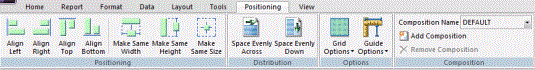下図のように、[均等間隔] グループには、プレシジョンレポートキャンバスに配置されたオブジェクト間の間隔を制御するコマンドがあります。