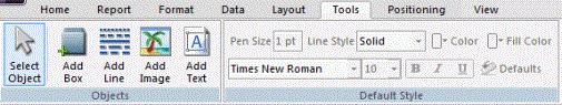 [デフォルトスタイル] グループには、プレシジョンレポートに追加するボックス、線、テキストオブジェクトをカスタマイズするコマンドおよびオプションがあります。下図は、[デフォルトスタイル] グループを示しています。