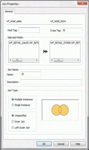 JOIN は、複数のデータソースが 1 つ以上の共通フィールドに基づいて、または JOIN コマンドで指定した条件に基づいて作成される一時的な結合です。たとえば、wf_retail_sales データソースに ID_STORE フィールドがあり、wf_retail_store データソースにも ID_STORE フィールドがある場合、これらの 2 つのデータソースを結合して JOIN を作成することができます。
