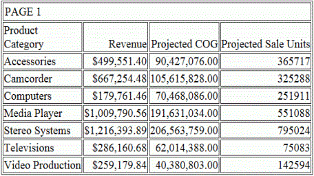 次の JOIN AS_ROOT コマンドを使用して、データを混合することができます。このコマンドは、テキストエディタを使用してプロシジャに入力することができます。この例では、「Projected」という名前の Excel ワークシートが wf_retail データソースの [製品] ディメンションの親として追加されています。レポート出力には、wf_retail_sales ファクトテーブルおよび Projected Excel ワークシートのフィールド値が製品区分別に表示されています。