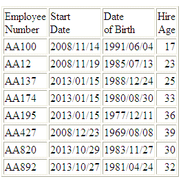 次のリクエストは、WF_RETAIL データソースを使用し、従業員の雇用時の年齢を計算します。