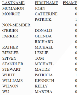 DEFINE FILE VIDEOTRK PNAME/I5=REGEX(FIRSTNAME,'PATRIC[(I?)K]'); END TABLE FILE VIDEOTRK PRINT FIRSTNAME PNAME BY LASTNAME WHERE LASTNAME GE 'M' ON TABLE SET PAGE NOLEAD ON TABLE SET STYLE * GRID=OFF,$ ENDSTYLE END