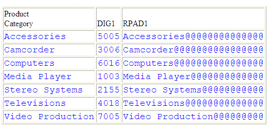 次のリクエストでは WF_RETAIL データソースが使用され、RPAD 関数が、PRODUCT_CATEGORY フィールドの右側にパディング文字「@」を追加します。