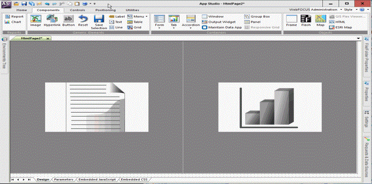 You can also select Events. When Events is selected, a list of all available JavaScript events that can be used in conjunction with an object appears. The events that are available change depending on what type of object is selected. For example, a report object has different events available than a button object. When no object is selected, events for the HTML page are displayed. Double-clicking on an event will create a function block for the selected object, using that event. You can view the created functions in the Embedded JavaScript and Embedded CSS tabs, where you can type the JavaScript code to execute when the selected event occurs.