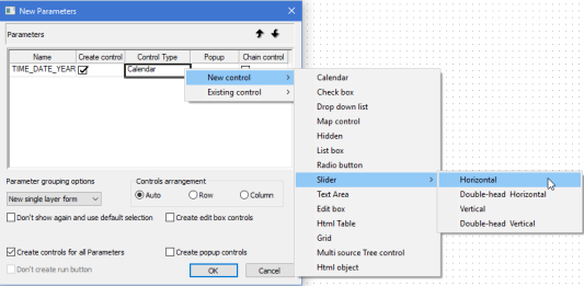 - When creating a control using the New Parameters dialog box, in the Create control column drop-down menu, click Virtual.