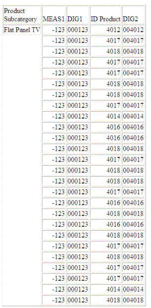 DEFINE FILE WF_RETAIL_LITE MEAS1/I8=-123.45; DIG1/A6=DIGITS(MEAS1,6) ; DIG2/A6=DIGITS(ID_PRODUCT,6) ; END TABLE FILE WF_RETAIL_LITE PRINT MEAS1 DIG1 ID_PRODUCT DIG2 BY PRODUCT_SUBCATEG WHERE PRODUCT_SUBCATEG EQ 'Flat Panel TV' ON TABLE SET PAGE NOPAGE END