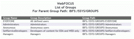 For example, running the get_groups FOCEXEC with the default WebFOCUS groups configured produces the output shown in the following image.