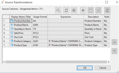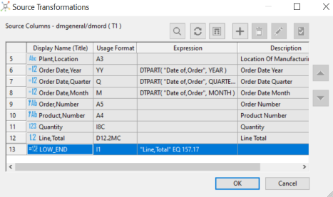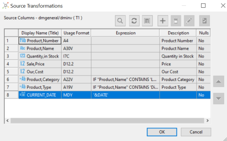 The relational expression appears as a column in the Source Transformations dialog, as shown in the following image.