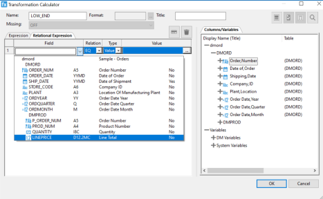 The Relational Expression tab of the Transformation Calculator allows you to build an expression that can be used as a filter.