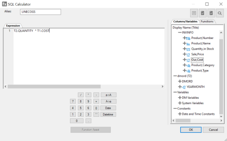 - Enter the calculation you want to perform using the Columns/Variables and Functions tabs, and the calculator buttons. For details, see SQL Calculator. For information about using functions, see Using an SQL Function. For information about using variables, see Using Variables in a Flow.