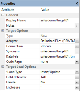 The Target Options section of the Properties pane for delimited file targets contains the following additional options.
