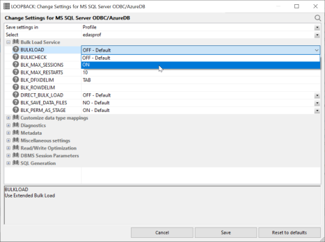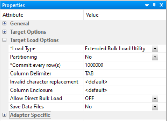 The options available will depend on the RDBMS of your target type. For more information on the options available for each adapter, see Informix Extended Bulk Load Options.