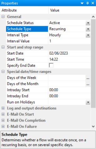 To access the Schedule attribute pane shown in the following image, right-click the Start object and click Properties.