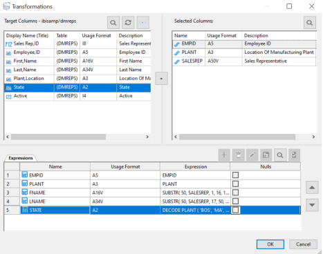 - Select EMPID, PLANT, and SALESREP in the Available Columns list and click the arrow to add them to the Selected Columns list. Click OK.