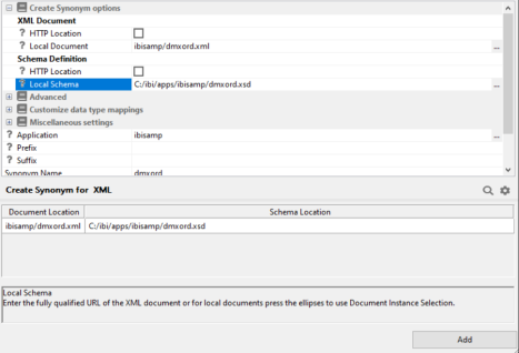 When creating an XML file, the format of the XML file is usually predefined by an XML schema definition or .xsd file. ibi Data Migrator lets you create a synonym from a schema definition and then map to that target in the same manner as a relational database table. An existing JSON document can also be used as a prototype for a synonym, which can then be used as a target.