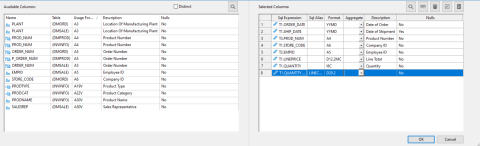 - For Alias, type LINCOGS and for calculation, expand DMPROD from the Columns/Variables tab. Double-click QUANTITY, type*, then expand DMINV and INVINFO. Select Our,Cost (COST) so that the Expression window shows T1.QUANTITY * T3.COST.